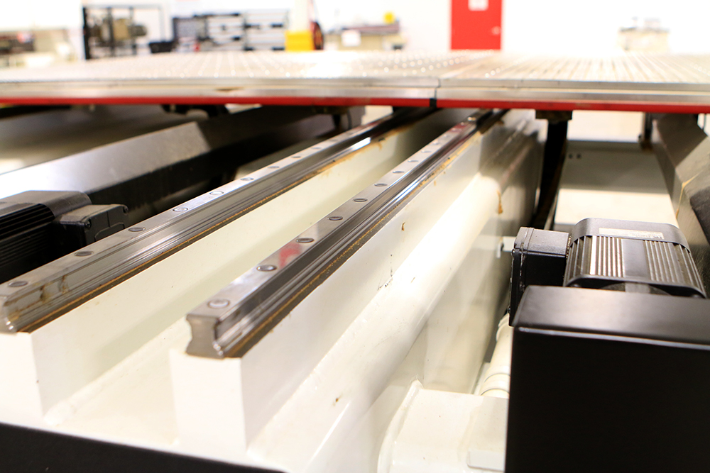 Fixed bridge design with twin moving tables allows for – up to – 3100 IPM programmable feed rates.