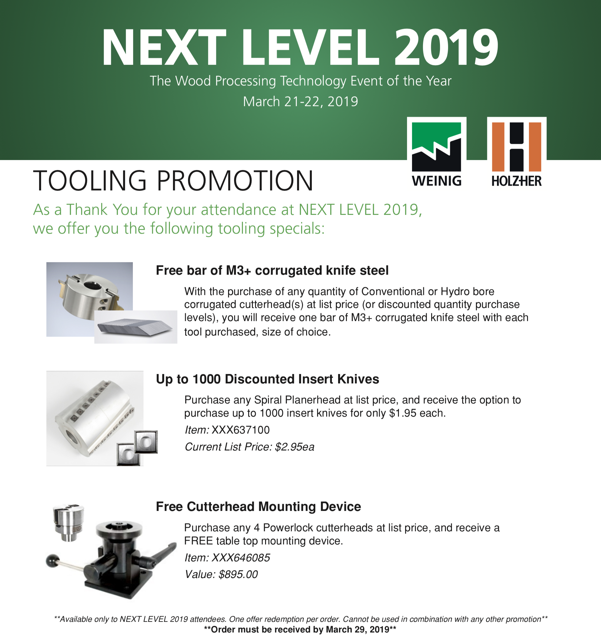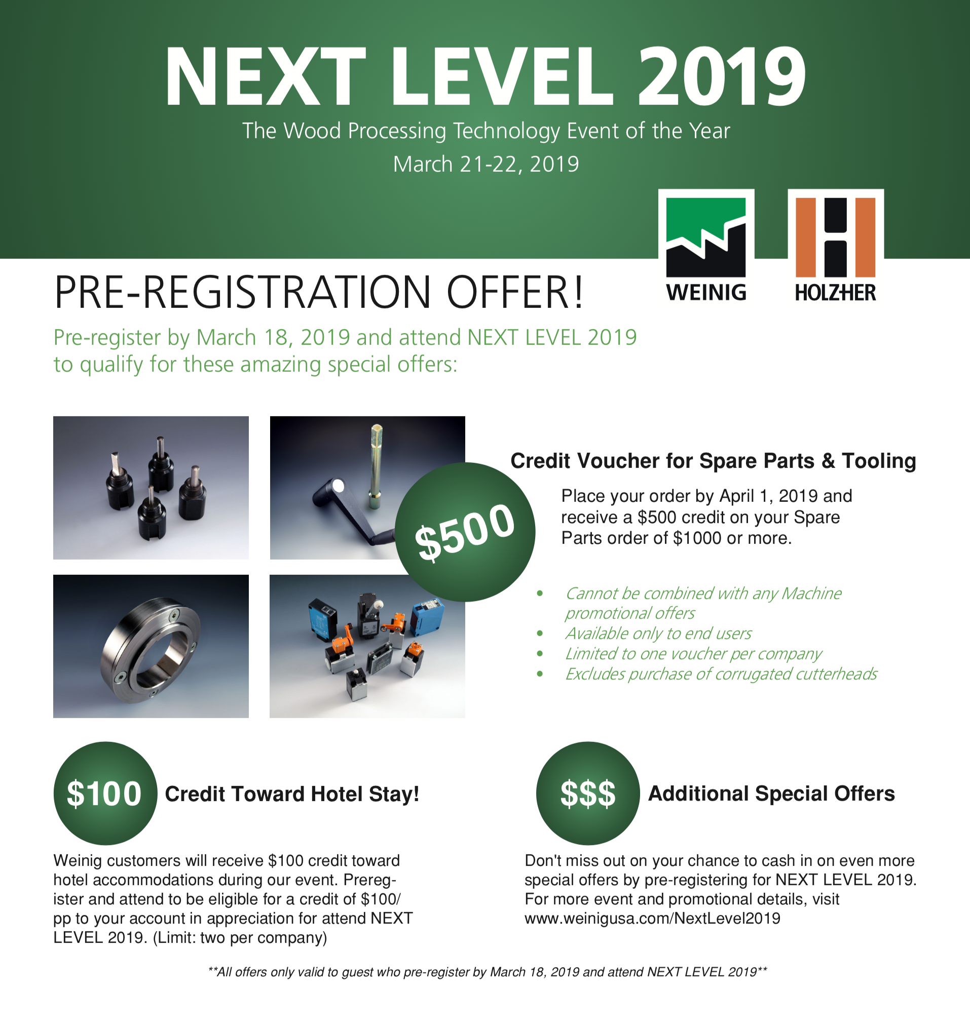 I would like to invite you to NEXT LEVEL 2019 – The Wood Processing Technology Event of the Year. Hosted by Weinig Holz-Her USA, this two-day event will demonstrate equipment and technology that will bring your shop to the next level. Join us for live machining demonstrations, relevant seminars, and a time to network with other woodworking professionals. Register online at www.weinigusa.com/NEXTLEVEL2019 .